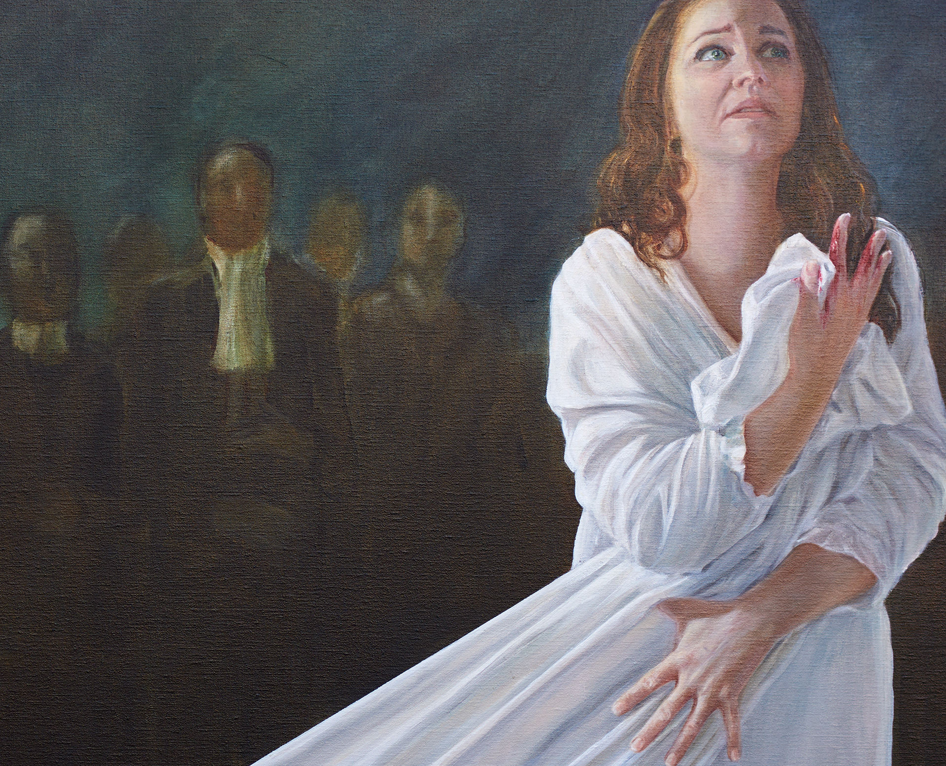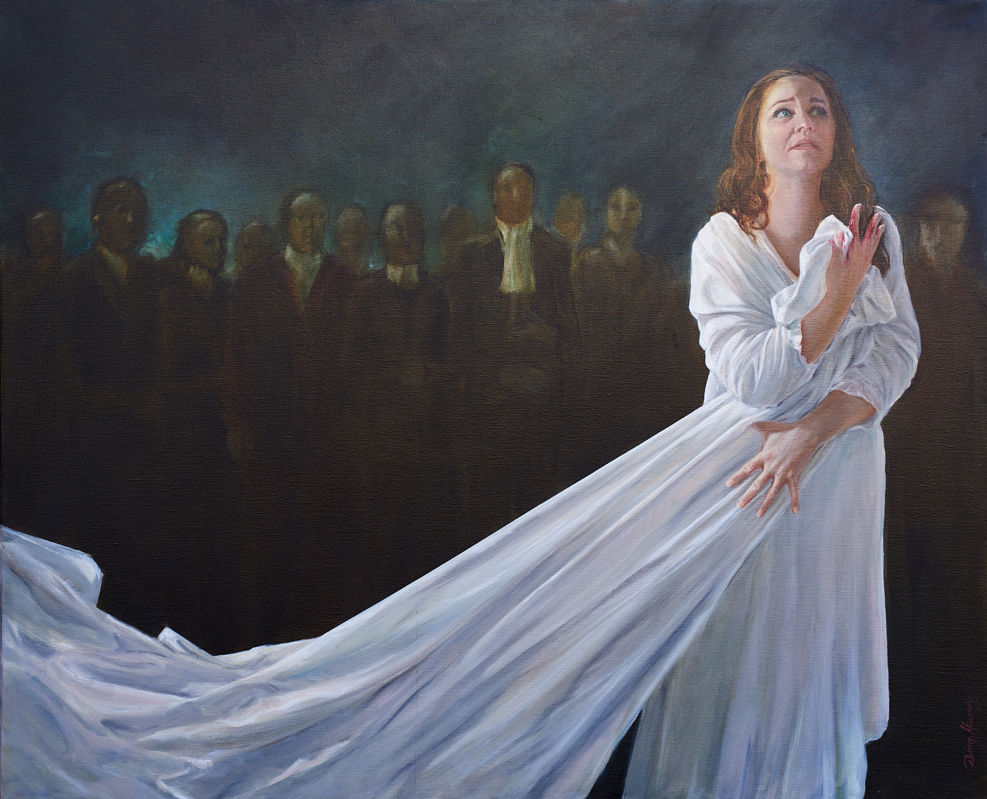 Emma Matthews is a highly accomplished soprano. One of her favored operas is "Lucia De Lammermoor" from Donizetti and I wanted to represent her in the act of performing on stage. The portrait is oil on linen 120cm h x 170 cm w